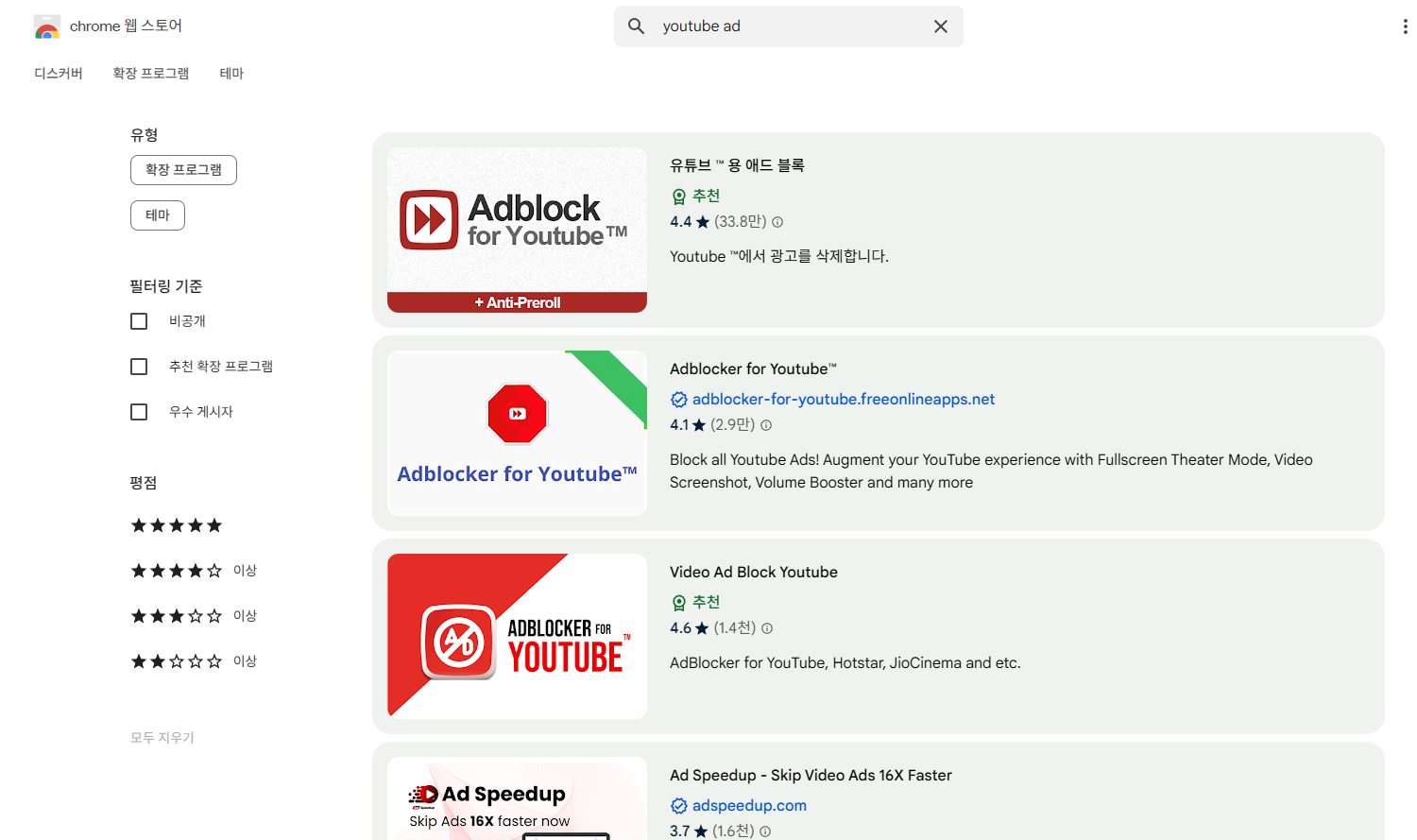 크롬 웹스토어에서, youtube ad 정도로 검색을 해보면, 광고 블로킹과 관련하여 다양한 앱들이 있다는 것을 알 수 있습니다.