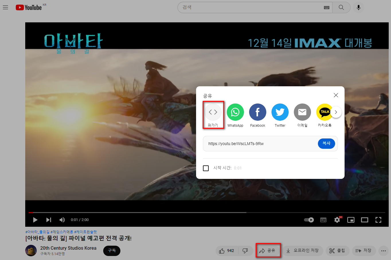 영상 하단의 [공유] 버튼을 누르고