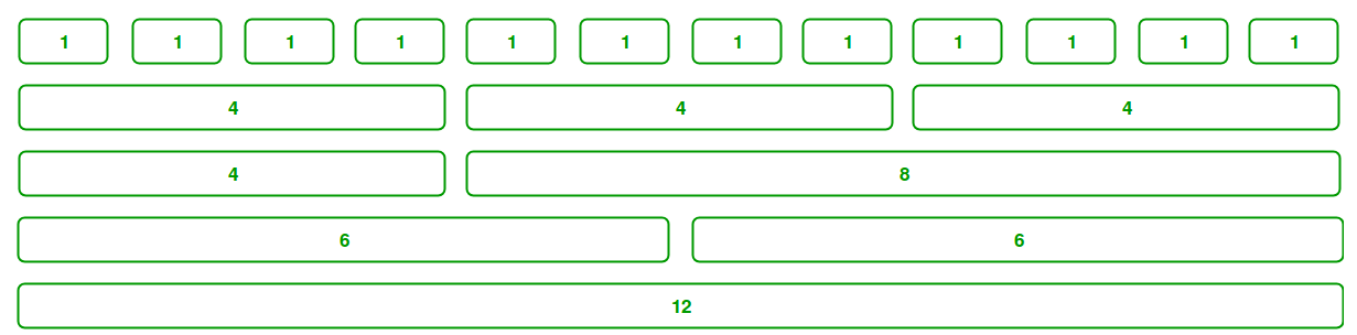 우선 부트스트랩은 12개로 구성된 가로폭을 사용하고 있습니다. 이게 부트스트랩 Grid의 기초인데요, 아래의 도표를 참고해서 보면, <Table>태그를 예로 들어 비유해보자면, 12개의 <td>를 갖고 있고, 각각의 숫자만큼 colspan을 하는 것과 비슷한 느낌이 듭니다.