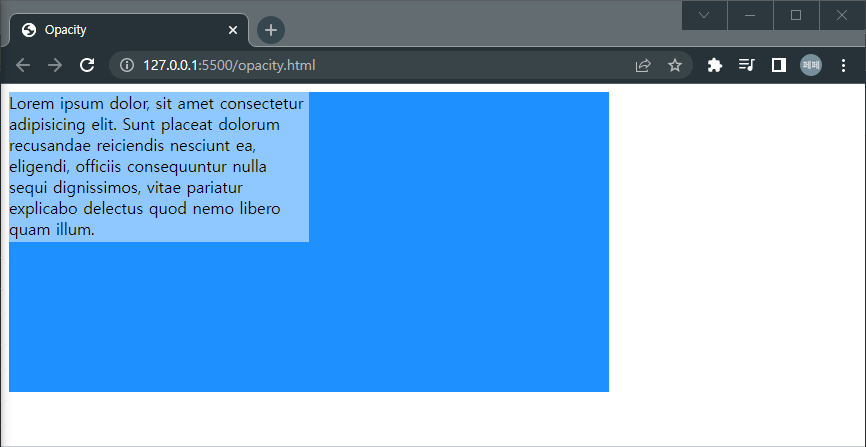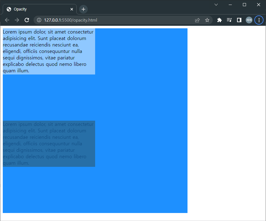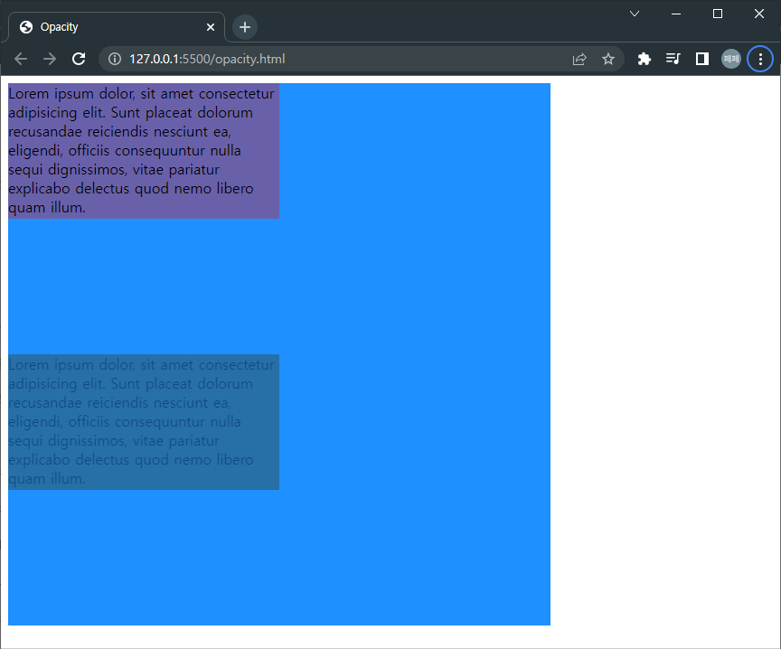 Opacity 속성은 RGBA와 같은 색상 또는 채널 중 하나가 아니라, 특정 엘리먼트에 적용해서 해당 컨텐츠 또는 포함된 자손까지 모두 포함하여 투명도를 결정하는 특성을 가집니다.