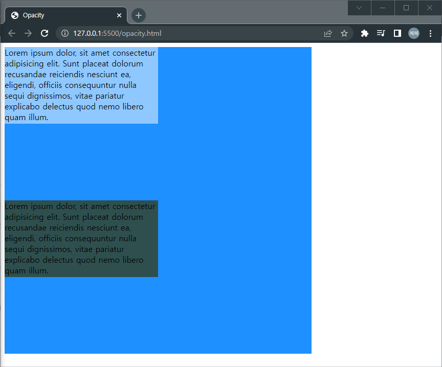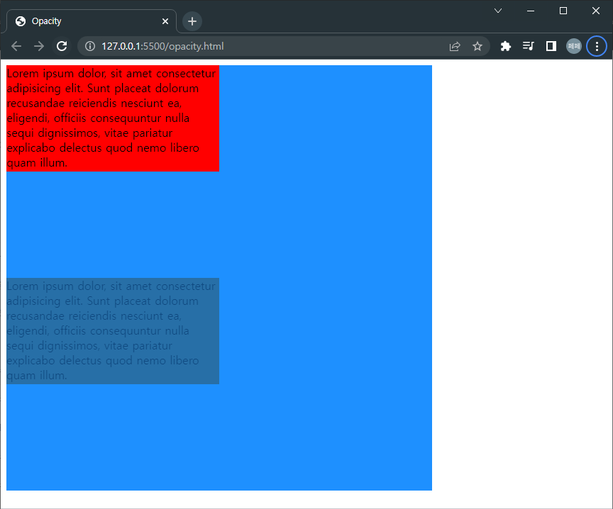 Opacity 속성은 RGBA와 같은 색상 또는 채널 중 하나가 아니라, 특정 엘리먼트에 적용해서 해당 컨텐츠 또는 포함된 자손까지 모두 포함하여 투명도를 결정하는 특성을 가집니다.