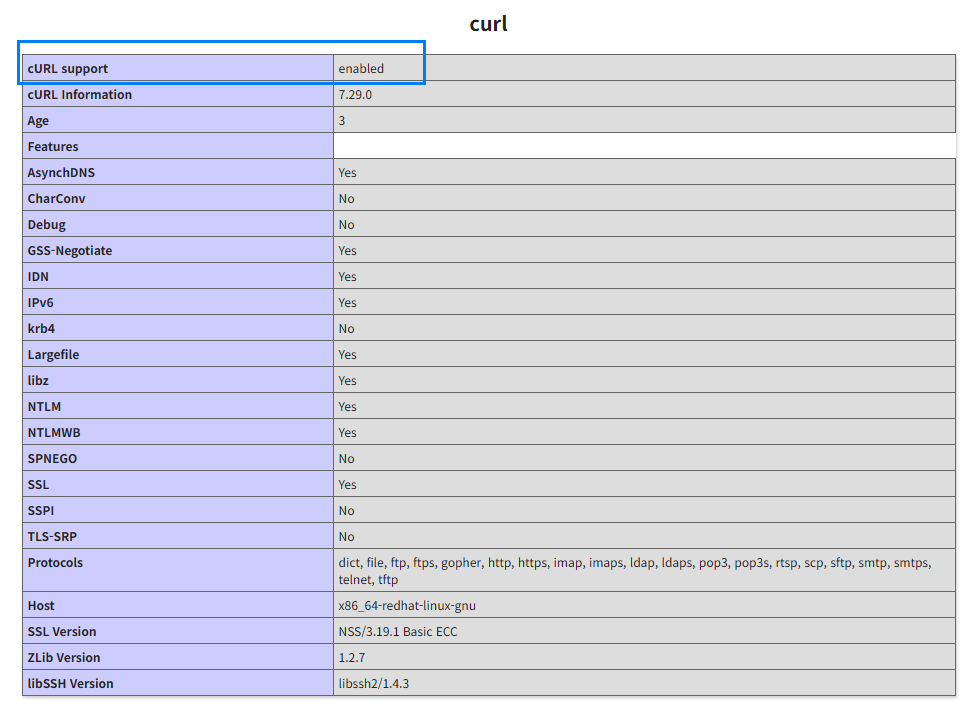 아래는 phpinfo(); 함수를 실행하면 브라우저에 보여지게 되는 여러 정보들 중에 curl에 관한 부분입니다.