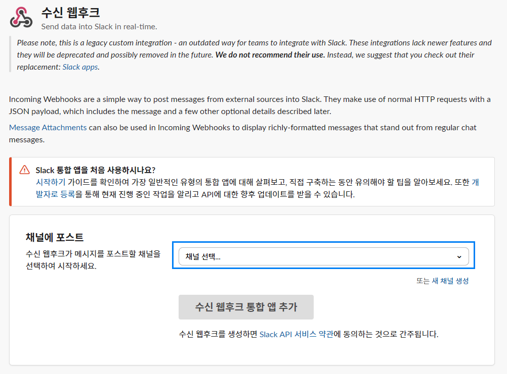 [Slack에 추가] 버튼을 클릭해주고, 현재 생성하려는 이 WebHook을 동작하게 만들 채널을 선택하거나 새로 생성해줍니다.
