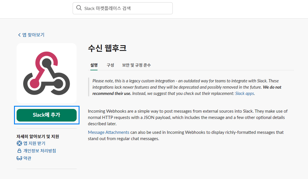 인커밍 웹훅을 클릭해주면, 아래와 같이 '수신 웹후크'를 안내하는 페이지가 보여지고,