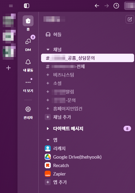 슬랙 앱에서 채널의 가장 하단에 [+] 앱 추가 버튼을 클릭해줍니다.