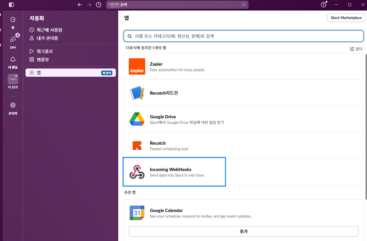 Slack에서 앱 추가 하기