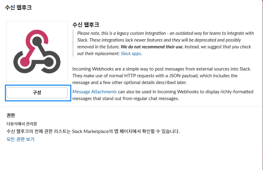 인커밍 웹훅을 클릭해주면, 아래와 같이 '수신 웹후크'를 안내하는 페이지가 보여지고,
