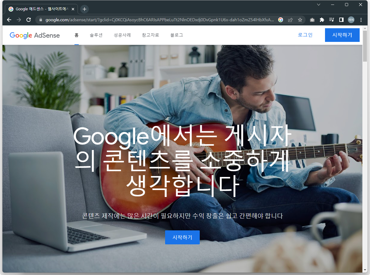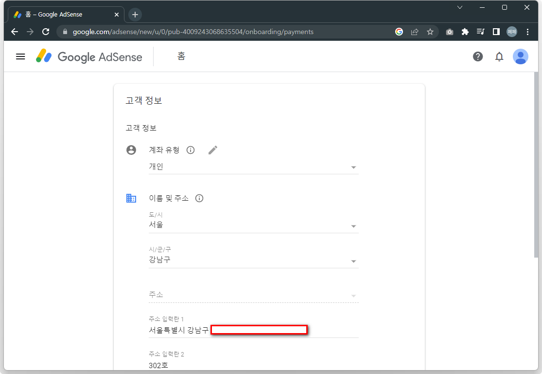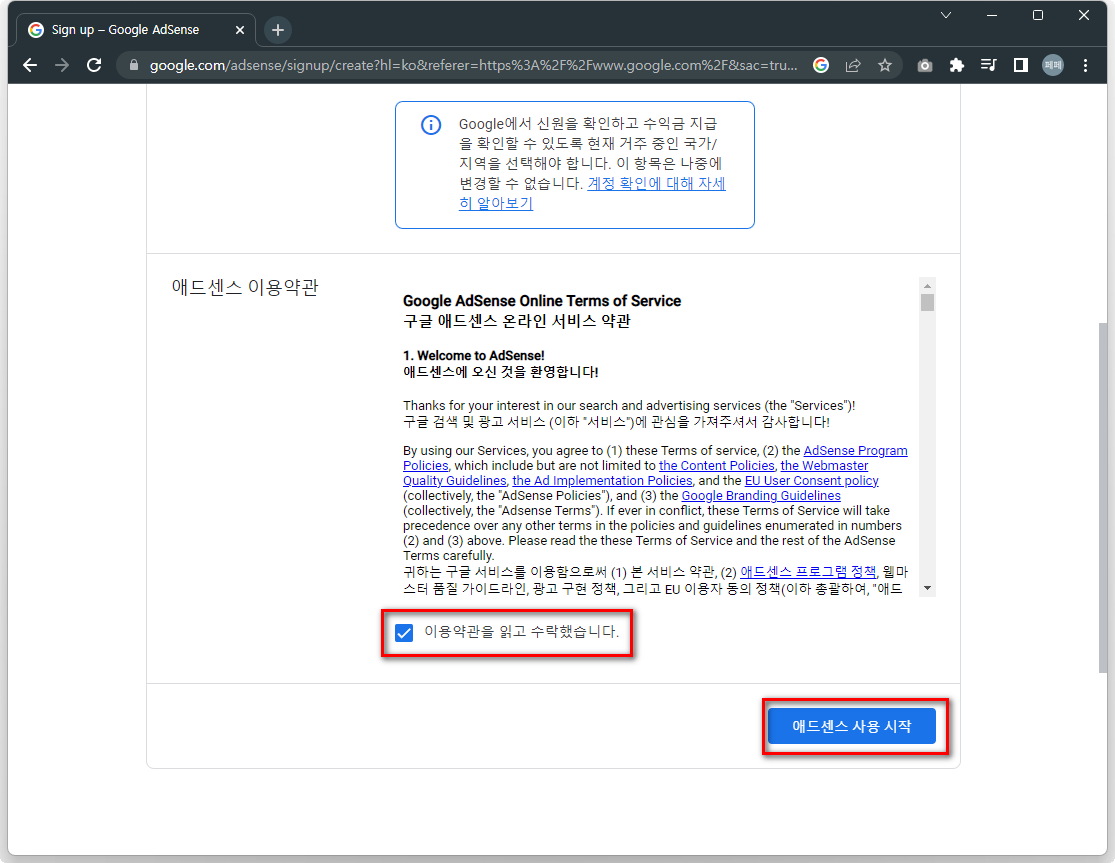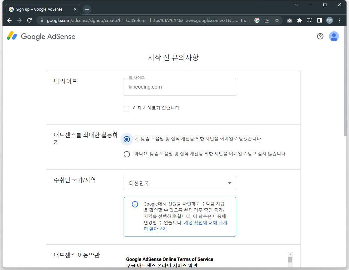 다시 구글 애드센스 신청 페이지로 돌아가서