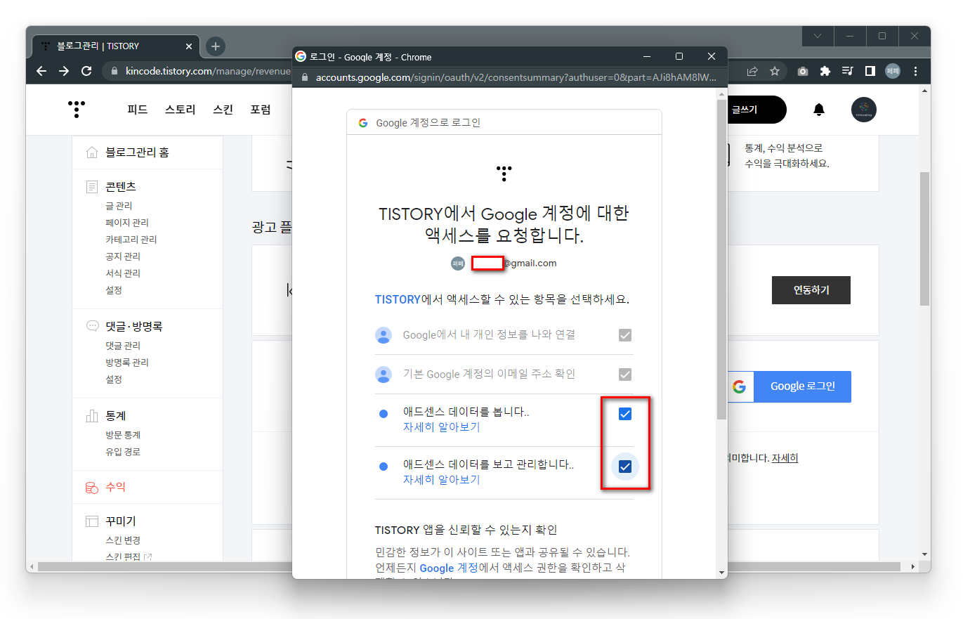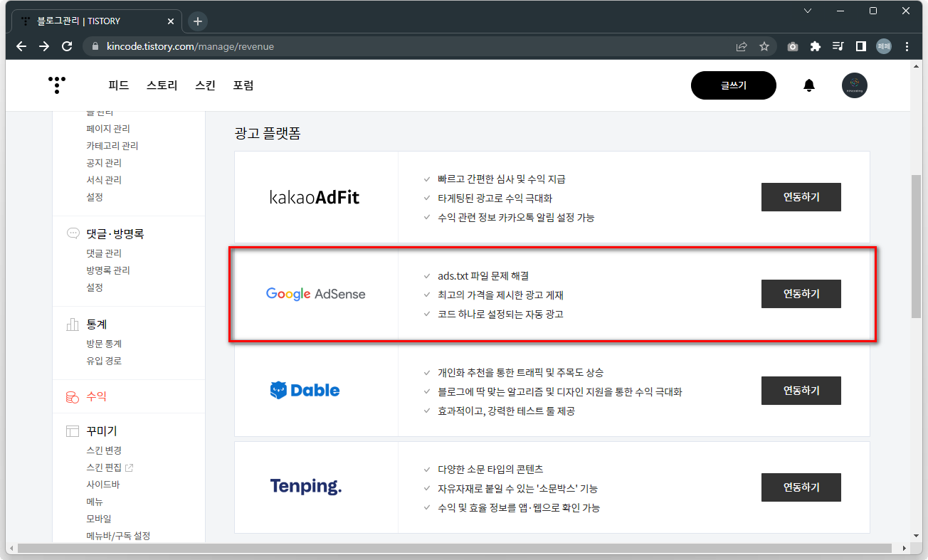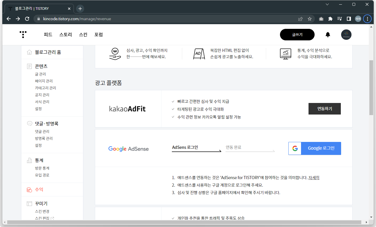 티스토리와 연결했고 이후 구글 애드센스 사용