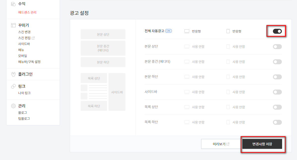 버튼을 켜주고 [변경사항 저장] 버튼을 클릭합니다.