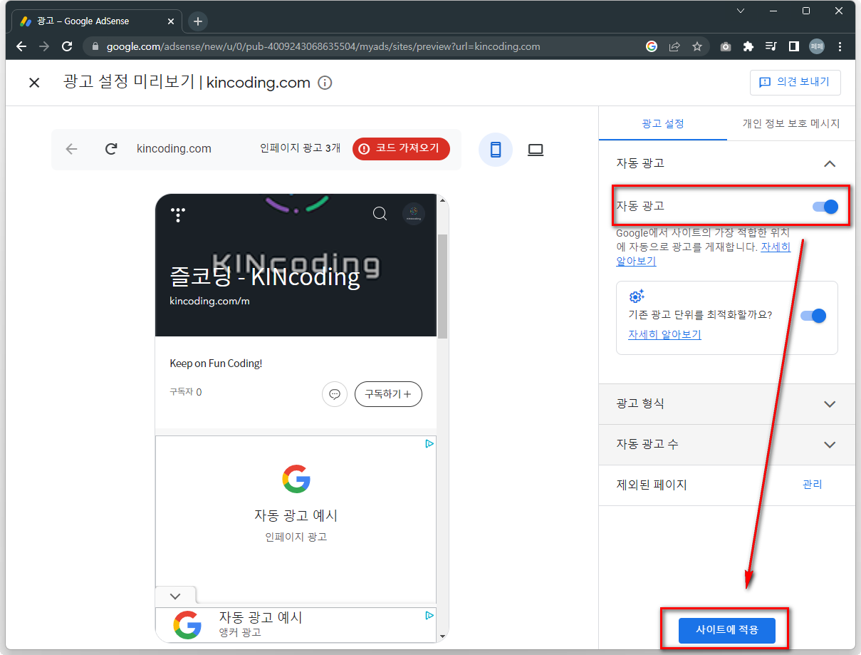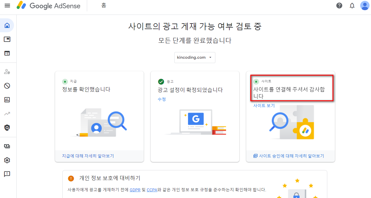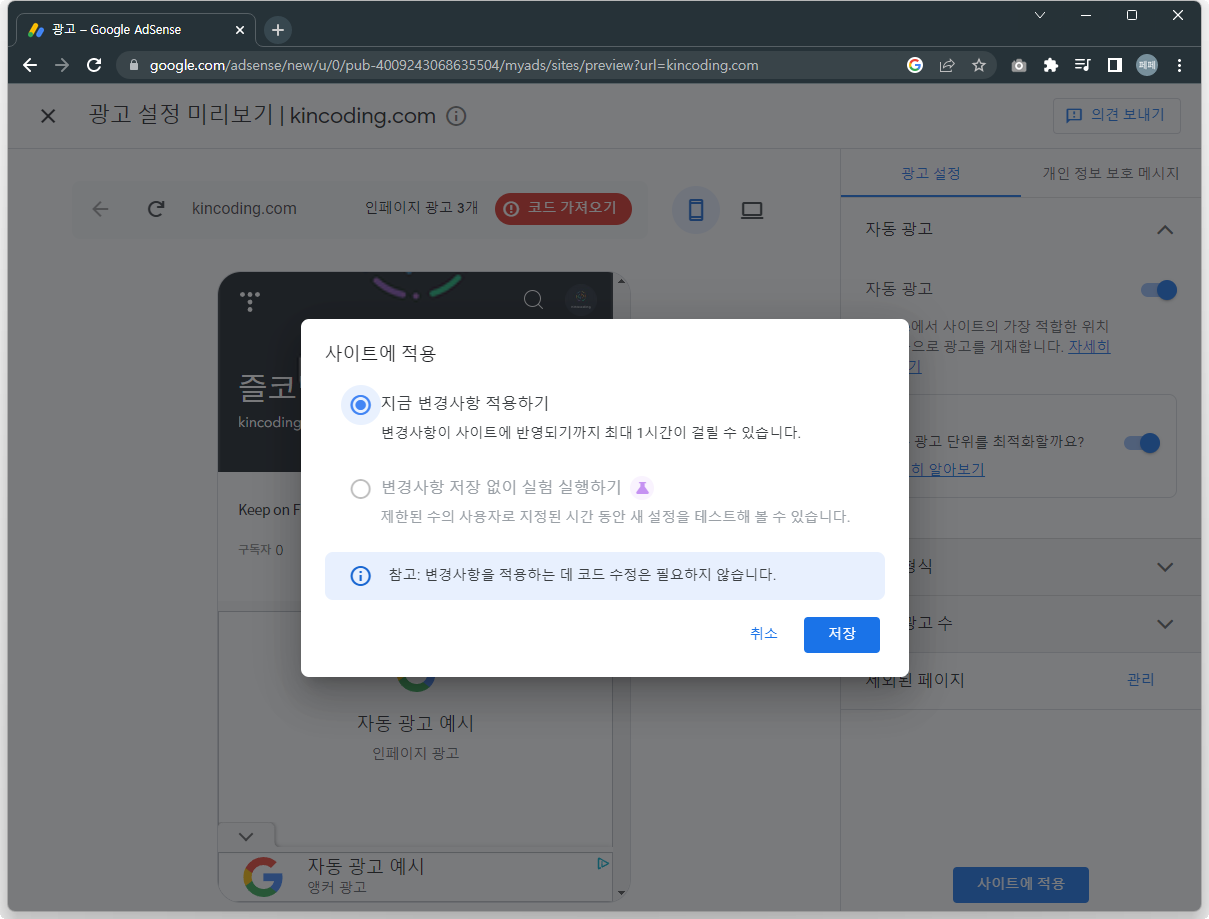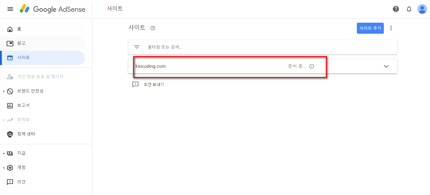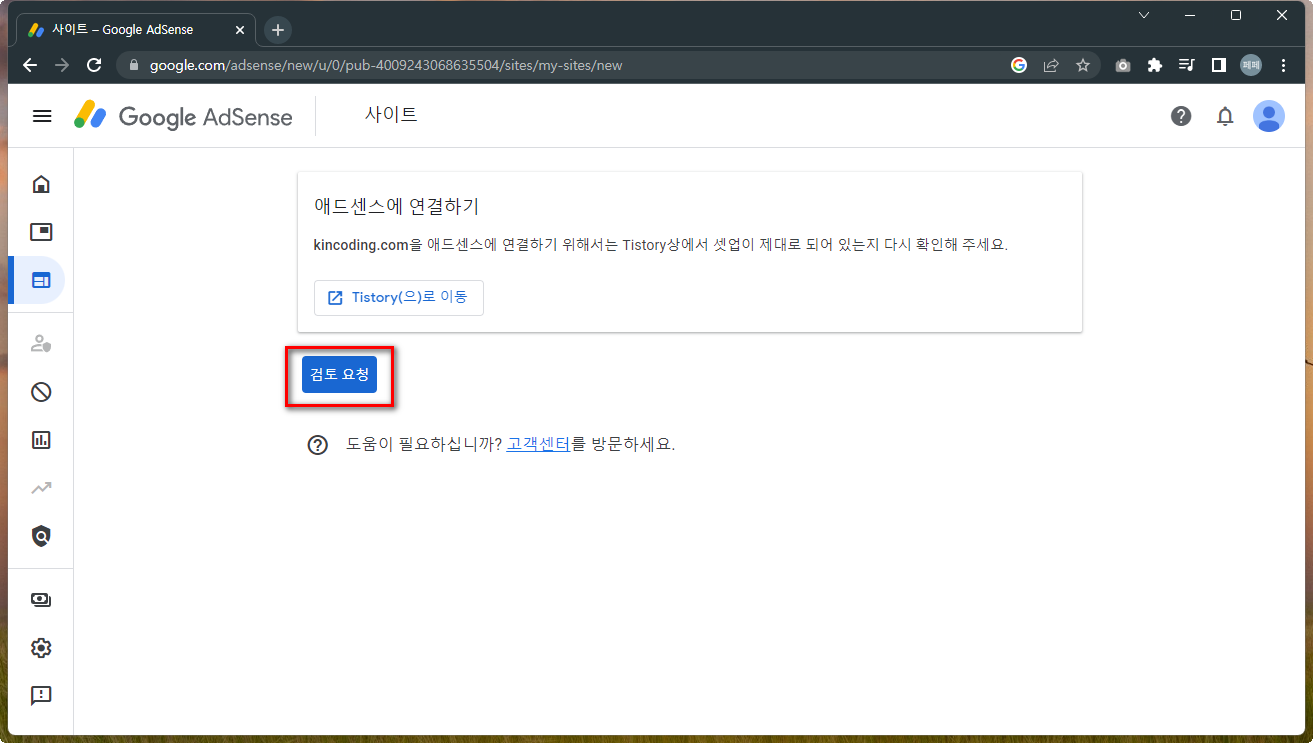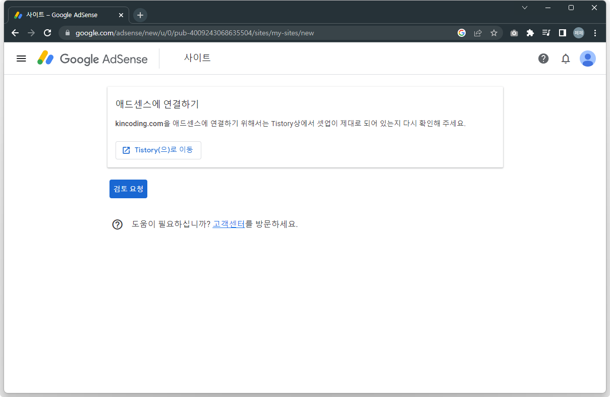 제가 애드센스를 신청하려는 도메인이 표시되는데