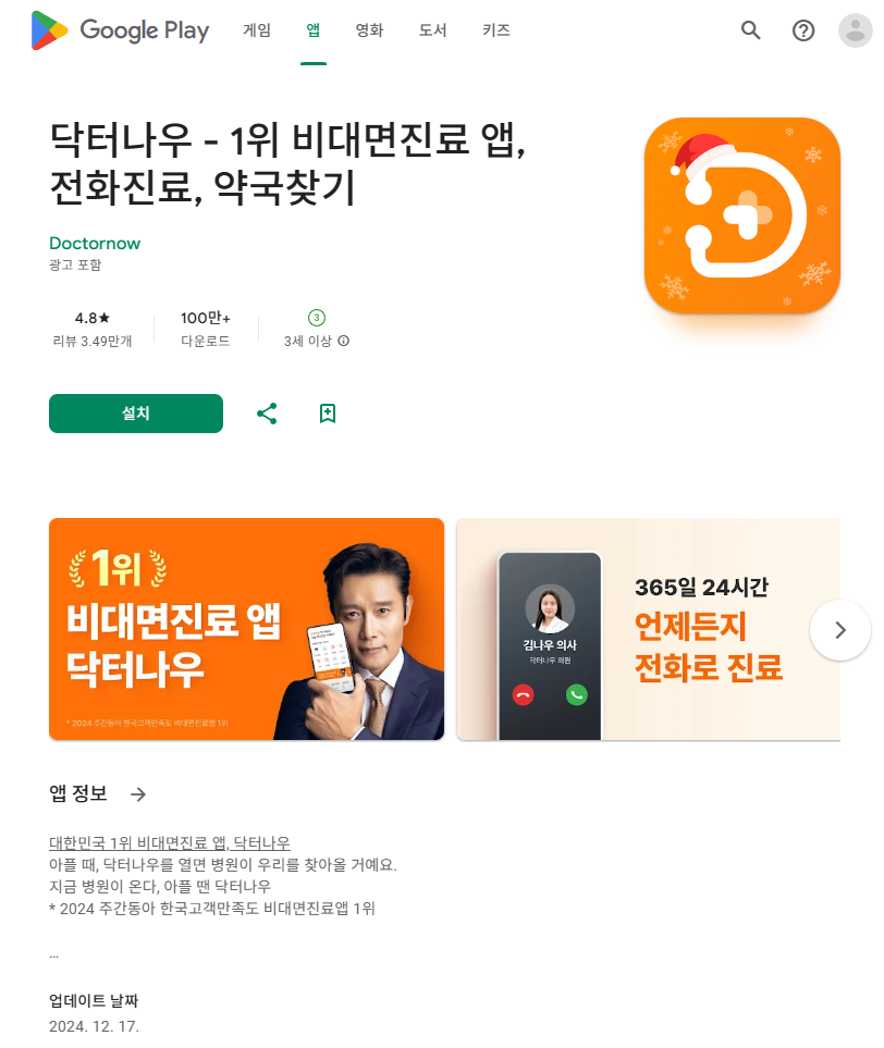 닥터나우는 배우 이병헌 씨를 모델로 기용했나봅니다. 다운로드 사용자는 100만+ 이지만, 후발주자로서 열심히 치고 올라오는 모양새라고 이해가 됩니다. 닥터나우 역시 비대면진료 시장으로의 진출을 도모하고 있는 것으로 보여집니다.