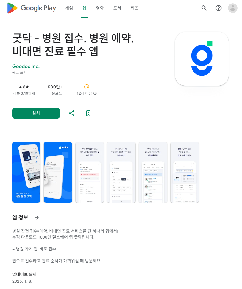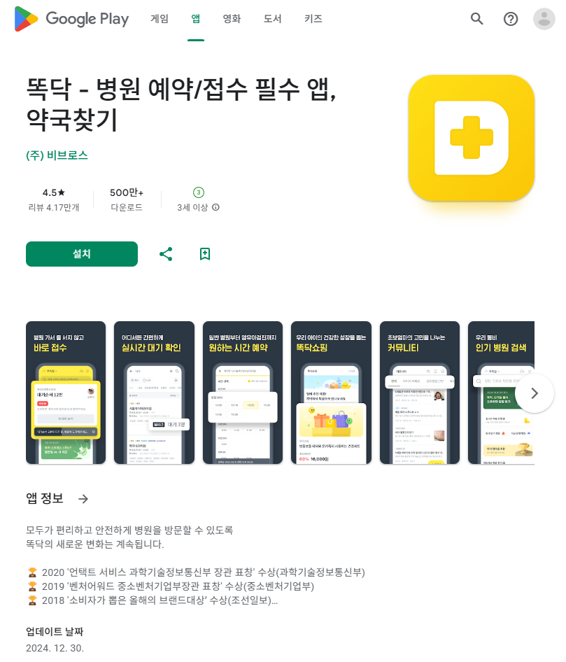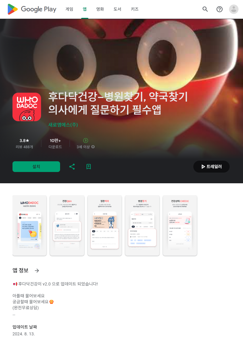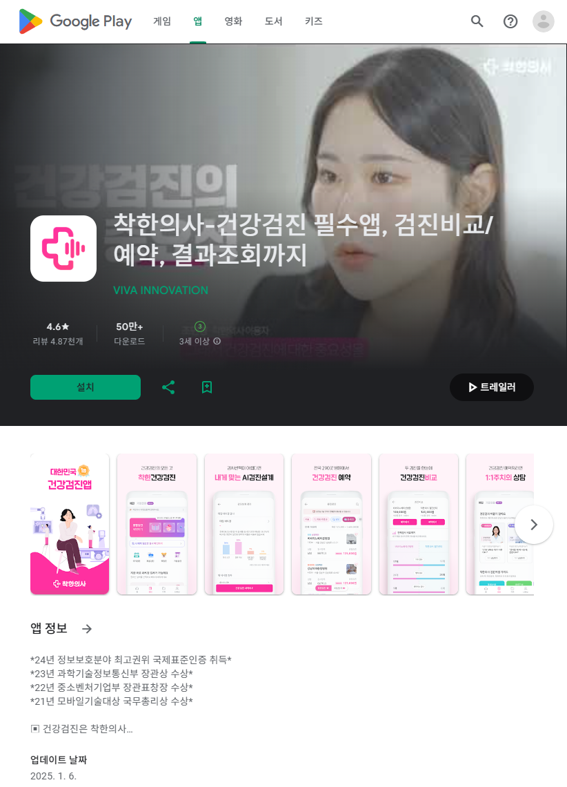 착한의사 앱은 Google Play 화면 구성이 특이하군요. 동영상 트레일러를 적용했습니다. 이거 다 구글 광고 상품이겠죠? 아무튼 착한의사 또한 다운로드 수는 50만+. 홍보문구에서는 '건강검진'이라는 단어를 사용하면서 '검진' 측면에서 포지셔닝 하고 있는 것으로 보여집니다. 공단 검진을 예약하려면 항상 병원에 먼저 가서 예약하고 약을 받아오곤 했는데, 어떤 점이 더 편리해졌을 지 저도 한번 다운로드 해서 사용을 해봐야겠습니다.