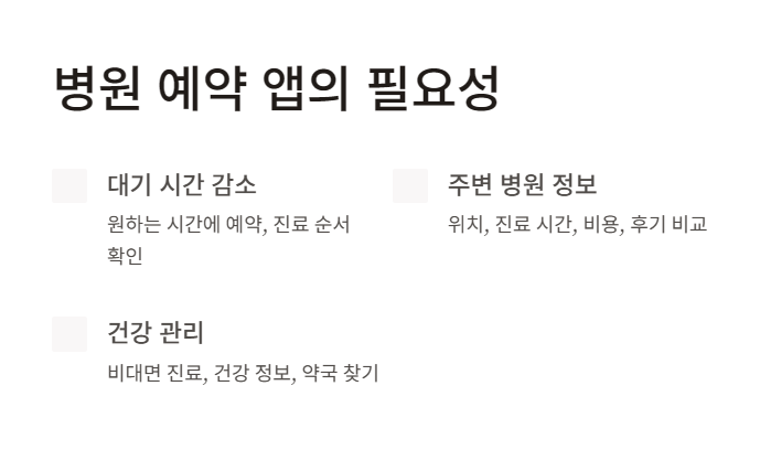 이제 병원 예약 앱으로 더욱 편리하고 스마트하게 예약하고 진료를 받는 편리함도 챙기시고, 건강도 함께 챙기시길 바랍니다.
