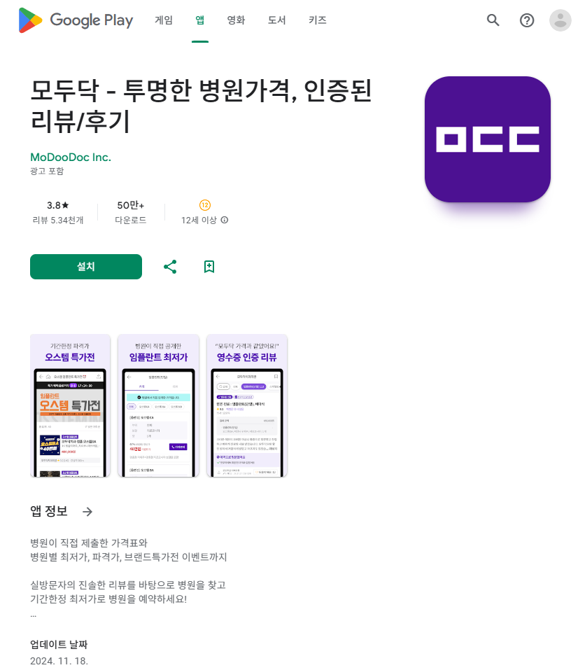 모두닥은 저도 역시 사용경험이 있는 앱입니다. 다운로드 사용자수는 50만+ 로 앞서 설명한 앱들보다는 상대적으로 사용자가 적어 보입니다. 네이버 지도 같은 데서도 병원을 검색하면 병원이용 리뷰/후기가 달려 있던데, 그런 후기들과 경쟁관계이지 않을까 싶은 생각이 듭니다. 진료비용을 사전에 확인하는 부분에 중점을 두고 있다고 보여집니다.