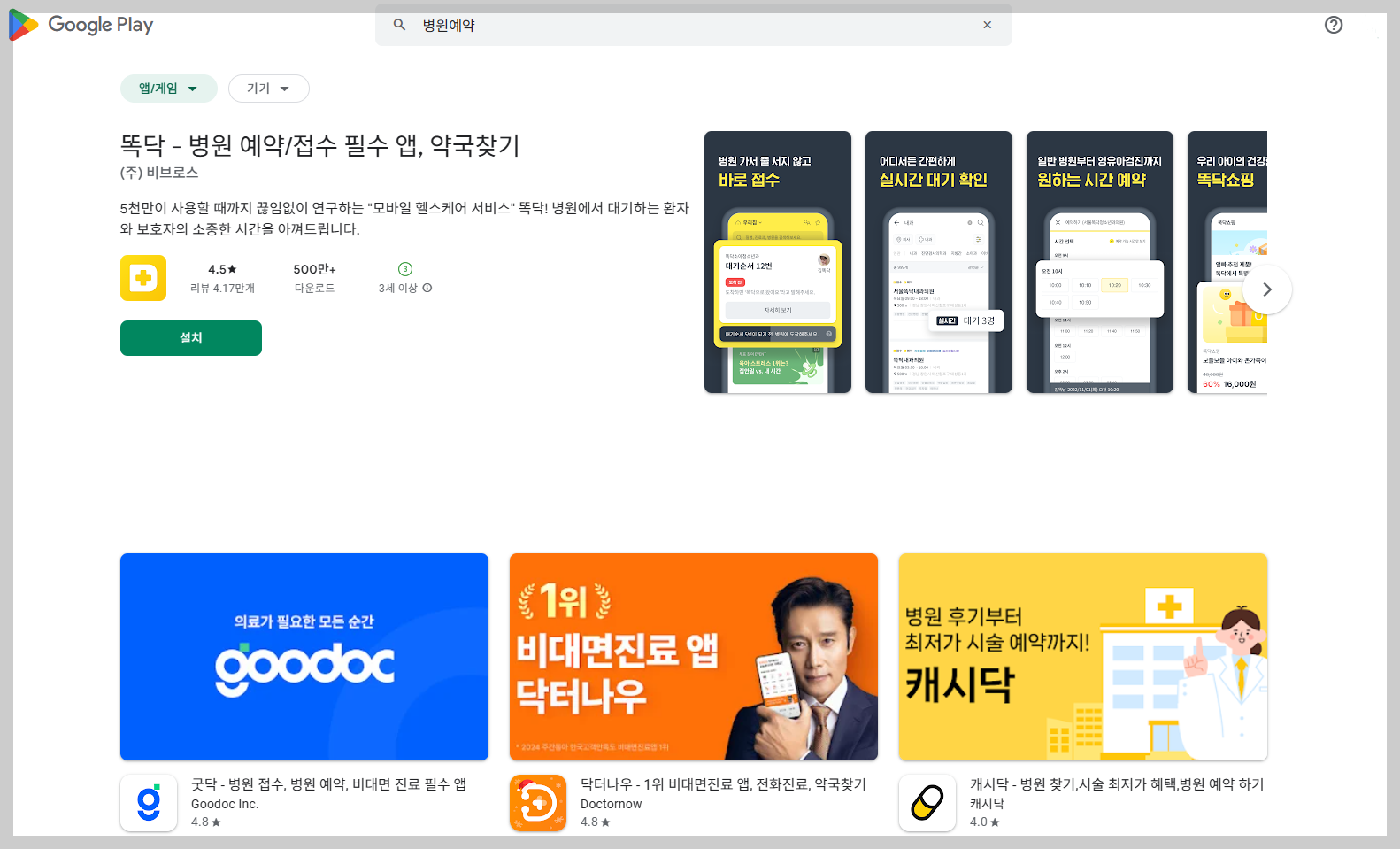 일단 오늘자로 Google Play에서 '병원예약'으로 검색을 해보니, 아래와 같이 검색이 되는군요.