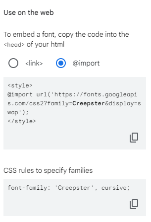 <link href="https://fonts.googleapis.com/css2?family=Creepster&display=swap" rel="stylesheet">