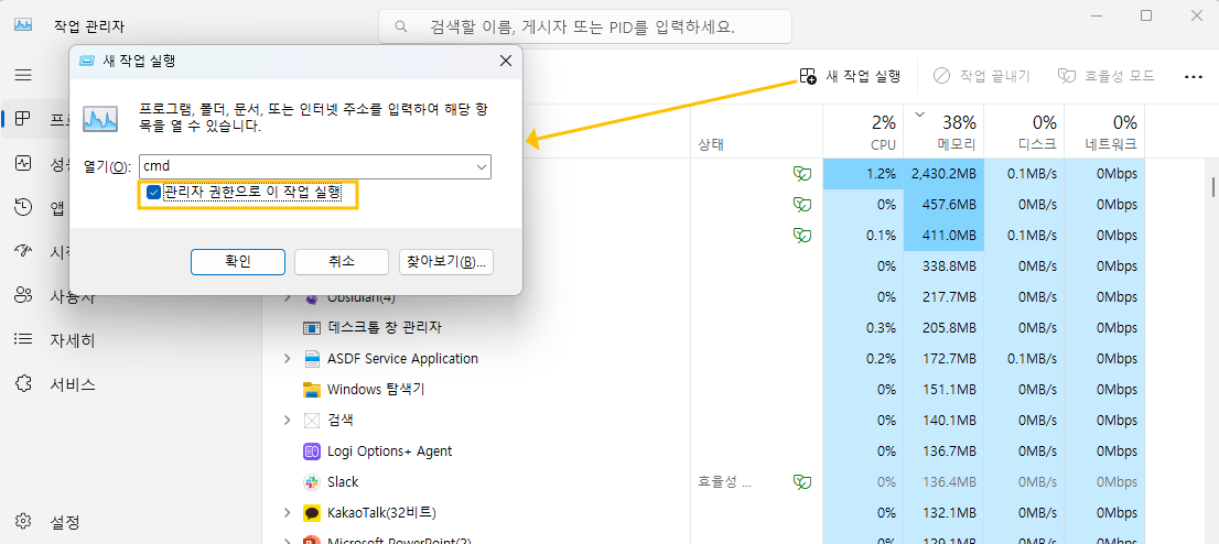 우측 상단의 <새 작업 실행> 버튼을 클릭하고 열기(O) 입력란에 cmd를 입력한 후, 하단의 권한을 체크해 주고 [확인] 버튼을 클릭해줍니다.