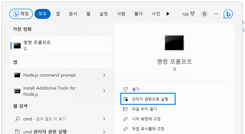 윈도우 돋보기 검색창에 CMD를 입력하고, 명령 프롬프트에서 '관리자 권한으로 실행' 을 해줘야합니다.