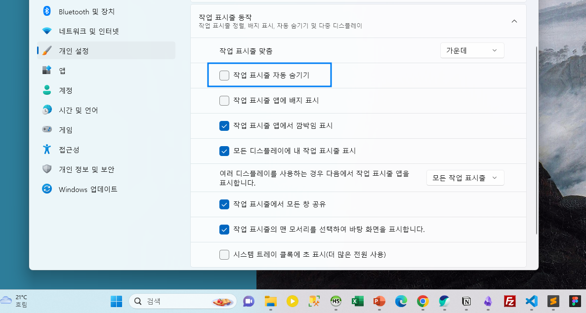 작업표시줄이 숨었다 나타났다 하는 기능이 체크되어 있는 지 우선 확인을 해봅니다.