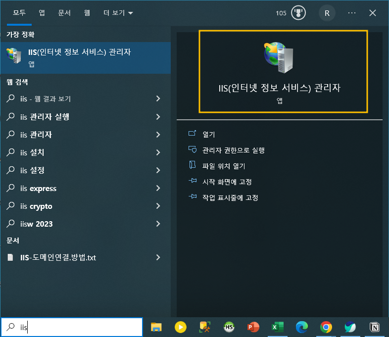 IIS가 설치되었습니다. 쉽죠? IIS(인터넷 정보 서비스) 관리자를 실행해줍니다.