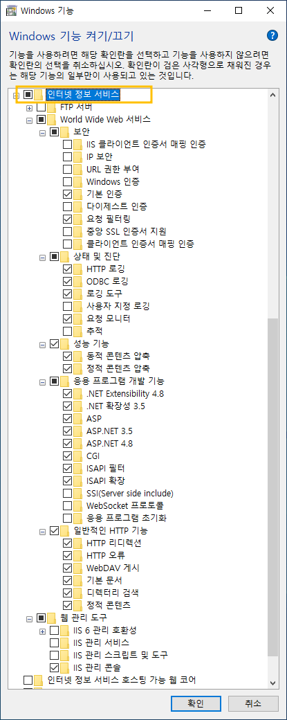 Window 10, Window11에는 IIS가 기본적으로 포함 되어 있다
