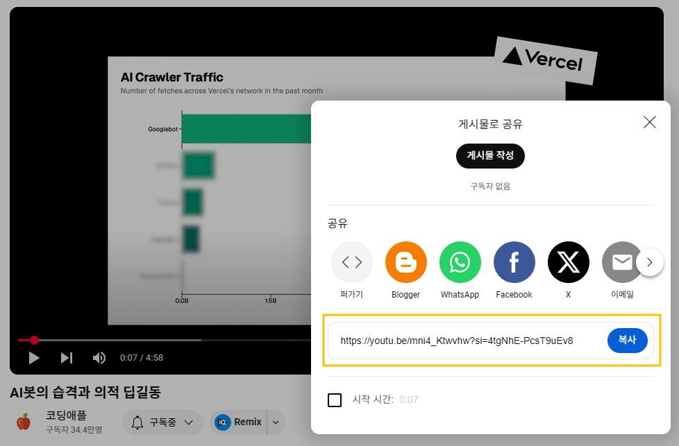 [공유하기] 버튼을 클릭하고, URL을 메모리에 복사해줍니다.