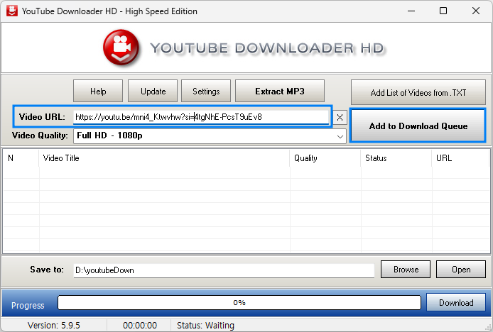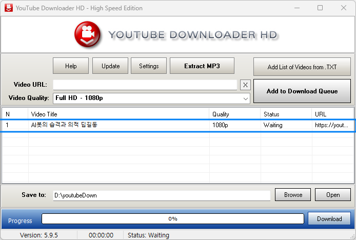 그리고 Yutube Downloader HD의 Video URL에 붙여 넣어 준 후, Add to Download Queue 버튼을 클릭해 줍니다.
