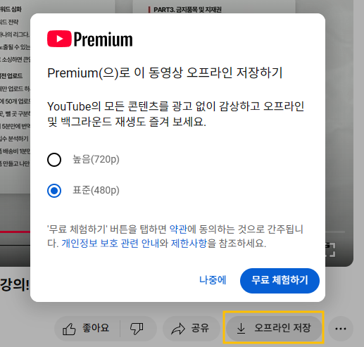 위 이미지처럼 [오프라인 저장] 버튼을 클릭하면, Youtube Premium 가입을 권하게 됩니다.