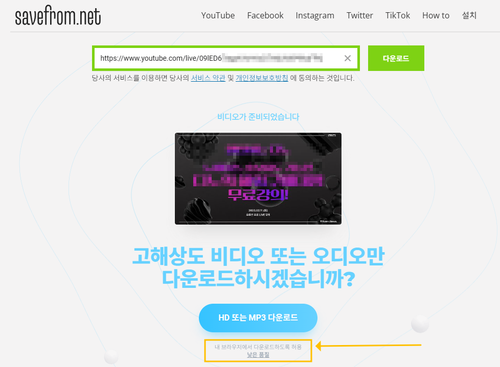 이후, 아래와 같이 미리보기 이미지가 보여지게 되는데, [HD 또는 MP3] 다운로드 버튼은 결국 유료결제를 하라는 창으로 이어지게 되구요, 바로 그 아래에 조그많게 있는 '낮은 품질' 버튼을 클릭하면 됩니다.