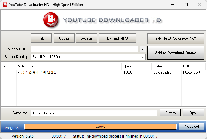 100%까지 Progress Bar가 진행되면 설정된 폴더로 영상이 다운로드 완료 됩니다.