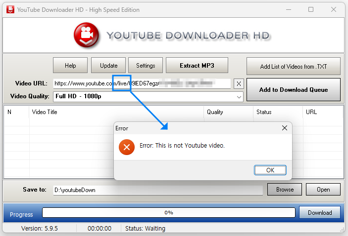 그런데, 한 가지 아쉬운 점이 있더라구요. 바로 '라이브' 영상은 다운로드가 되지 않는 다는 것인데요, 아마도 라이브 영상을 다운로드 받으려면 아래와 같은 Error 창이 뜨게 됩니다.
