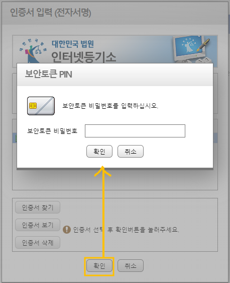 [확인] 버튼 클릭 후, 보안토큰 PIN 팝업창에서 보안토큰 비밀번호를 입력하고 [확인] 버튼을 클릭해줍니다.