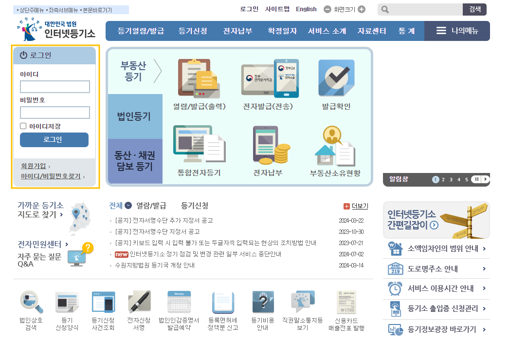 인터넷 등기소에 접속한 후 로그인을 해줍니다.