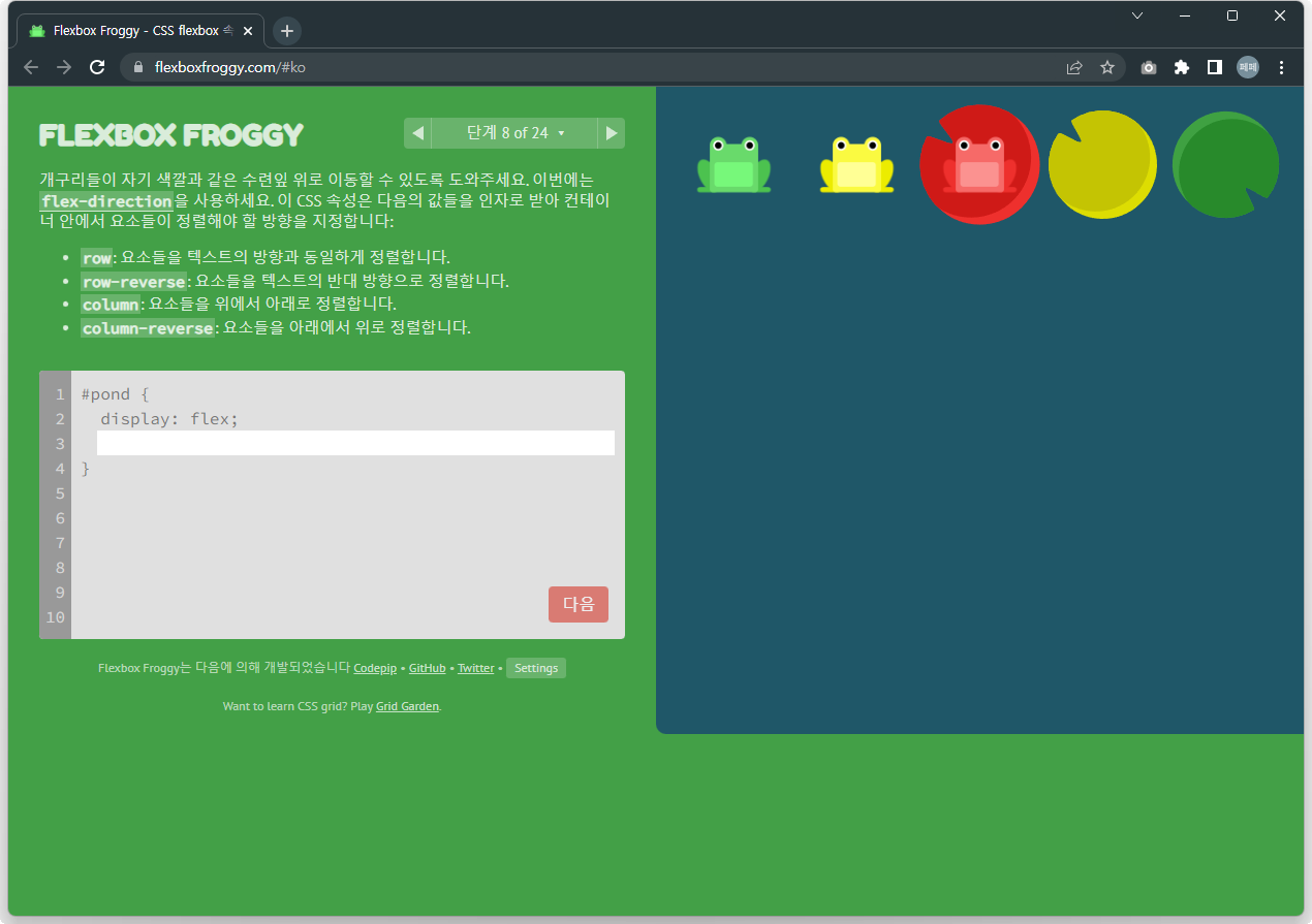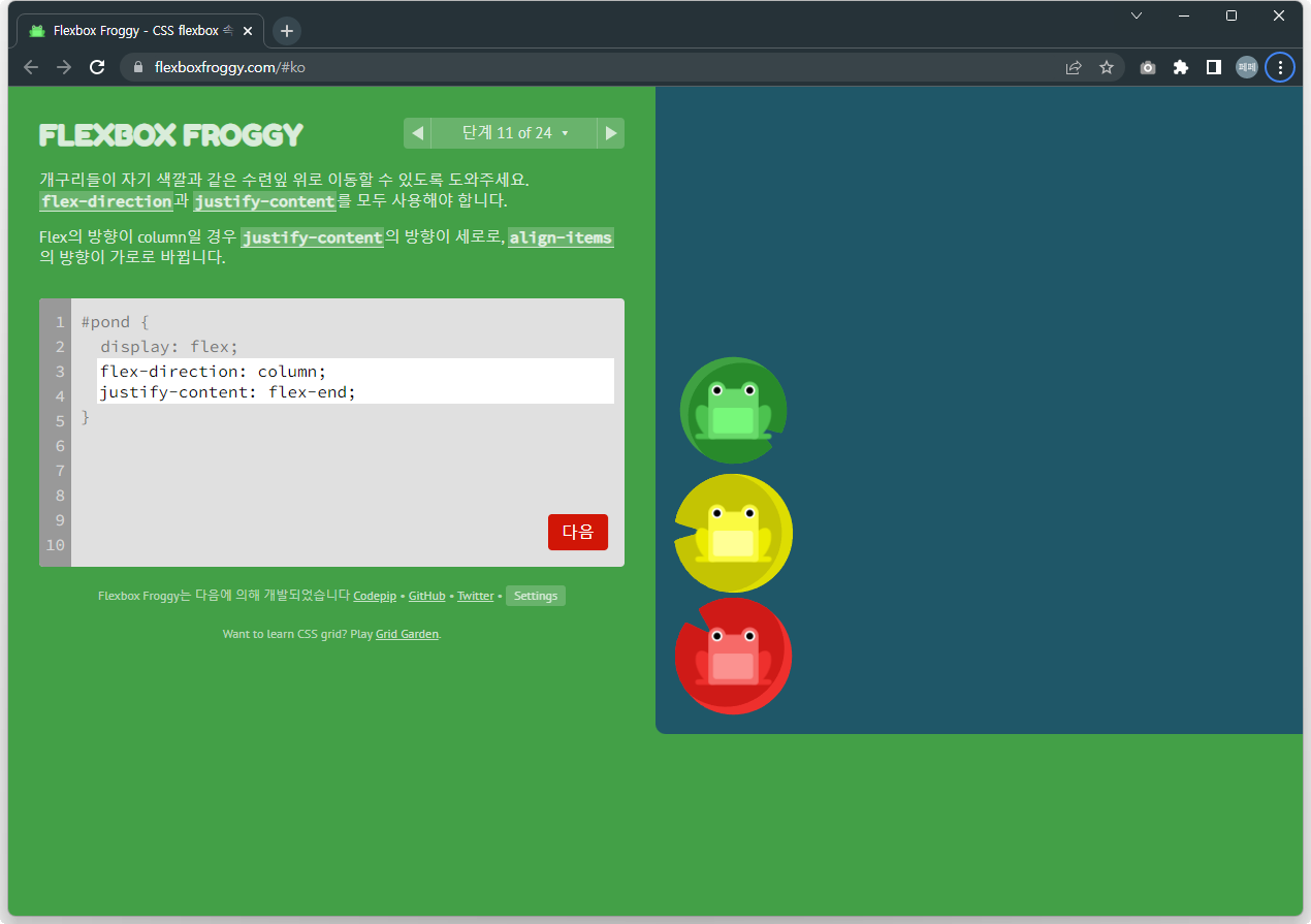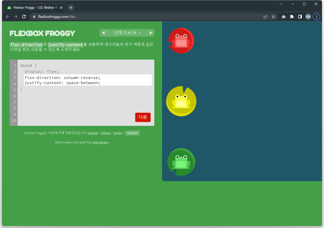 | 재미있게 Flex 공부하기 - Flexbox Froggy 문제풀이 13~24 (0) | 2022.12.02 |