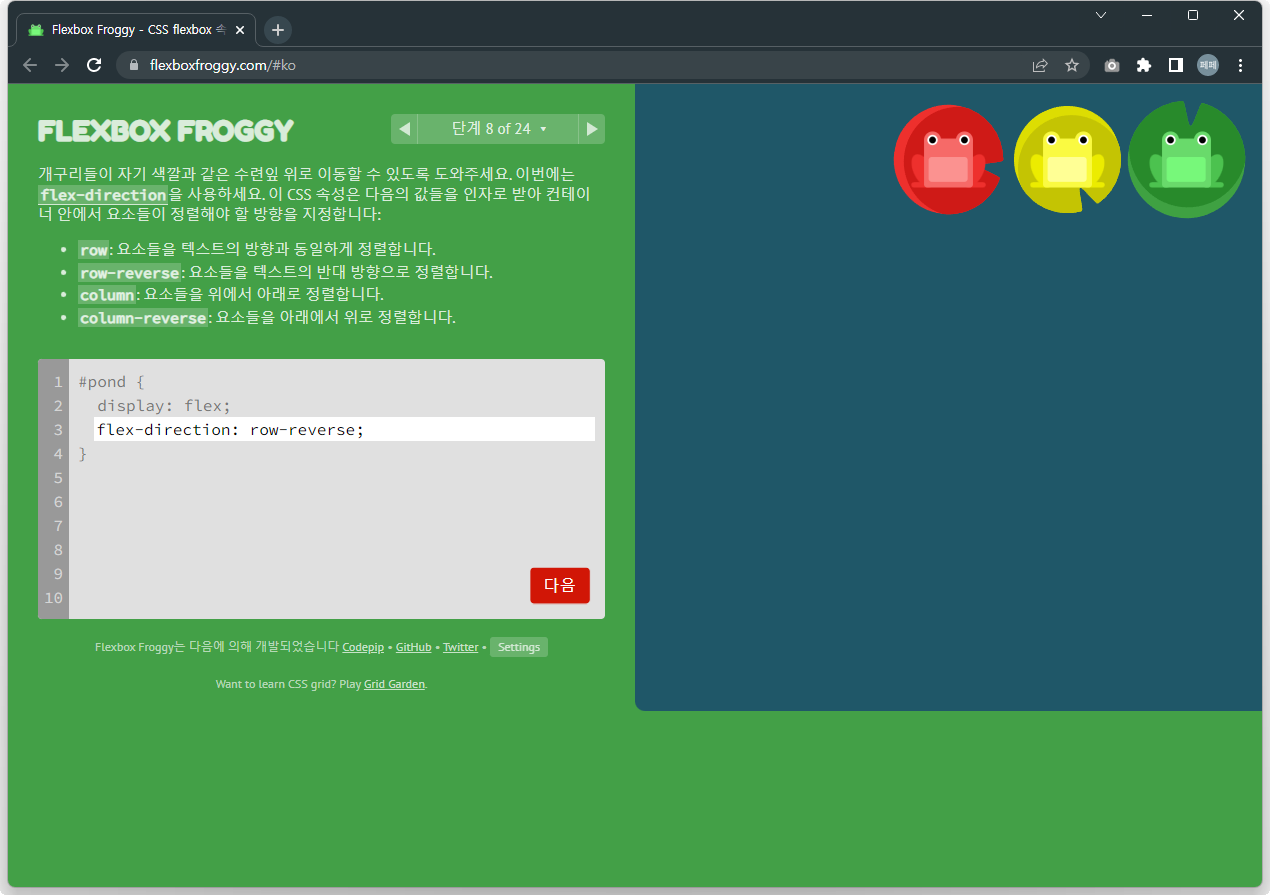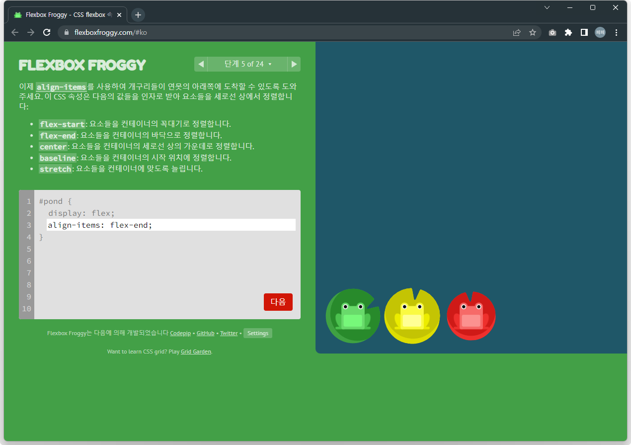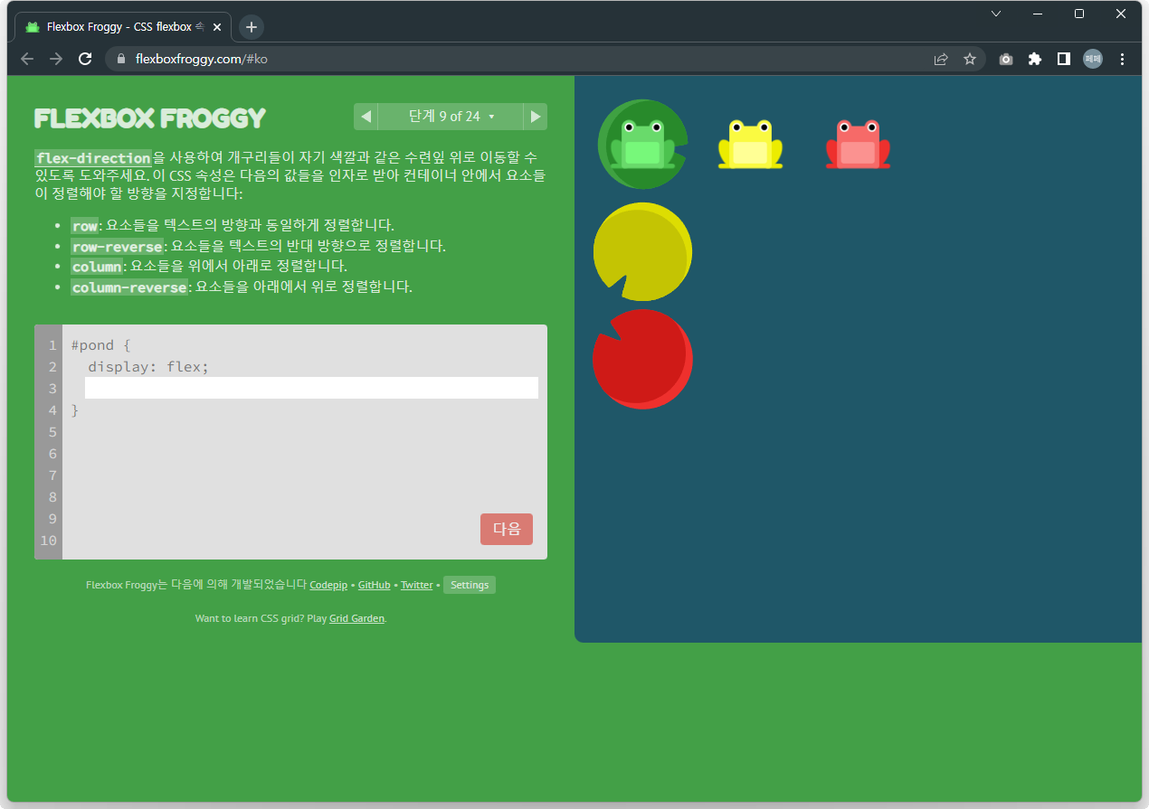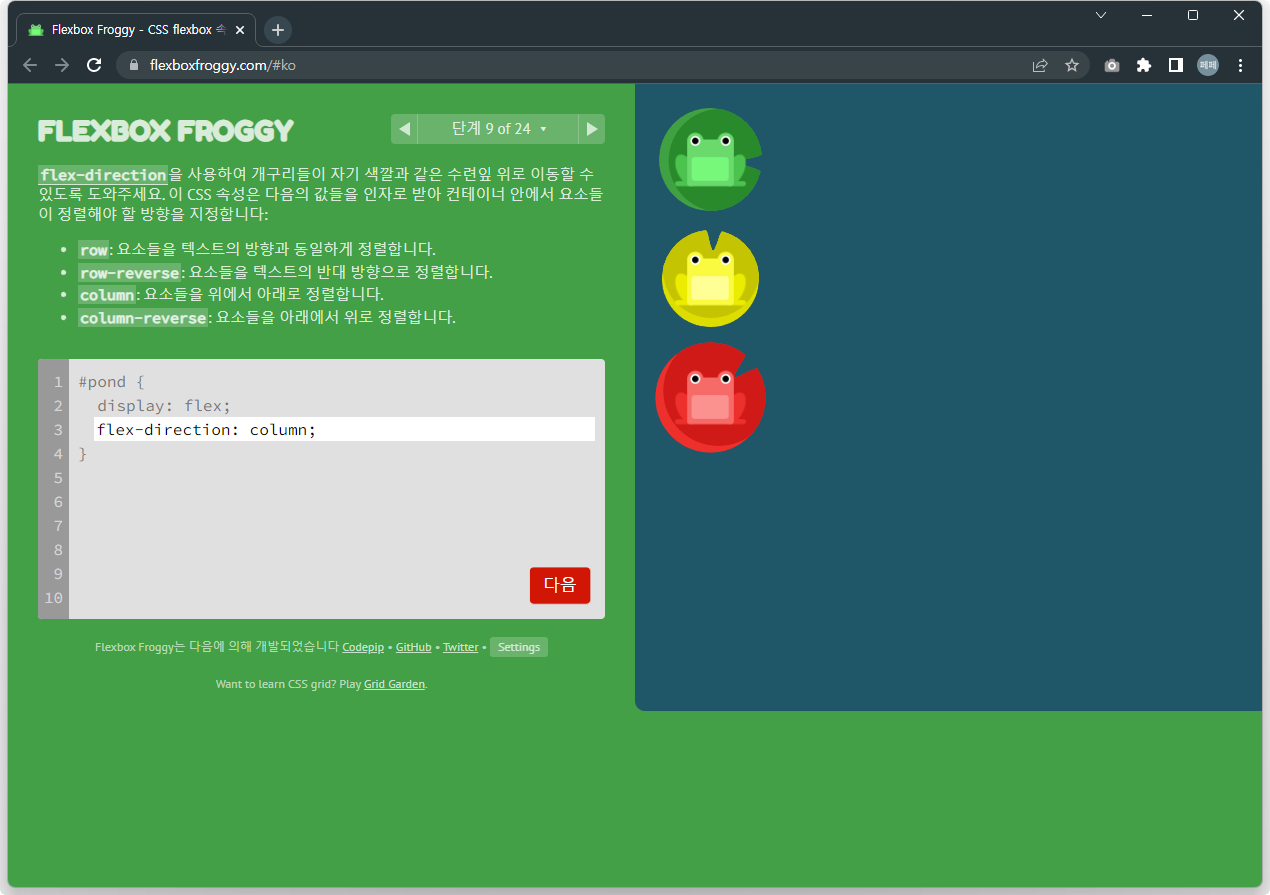 | 재미있게 Flex 공부하기 - Flexbox Froggy 문제풀이 13~24 (0) | 2022.12.02 |