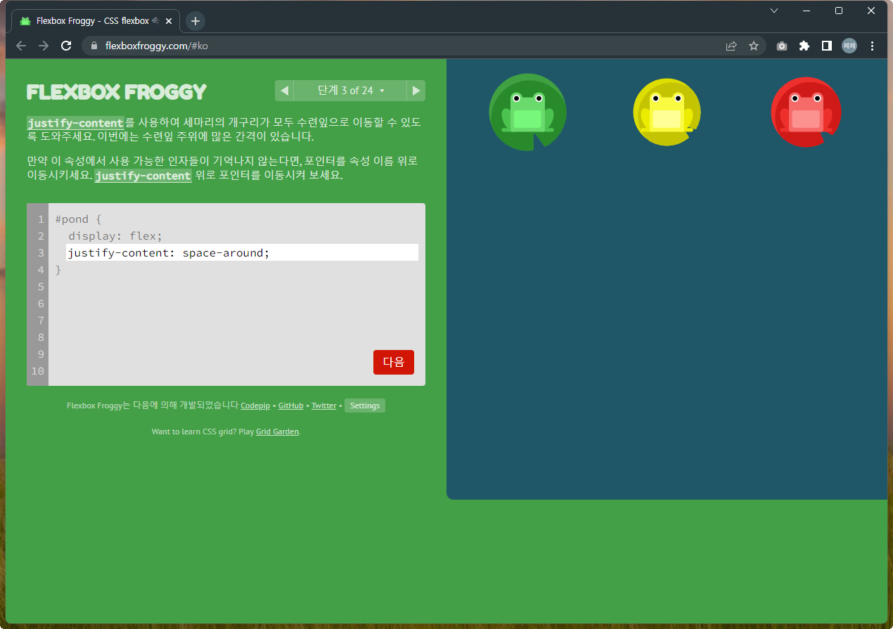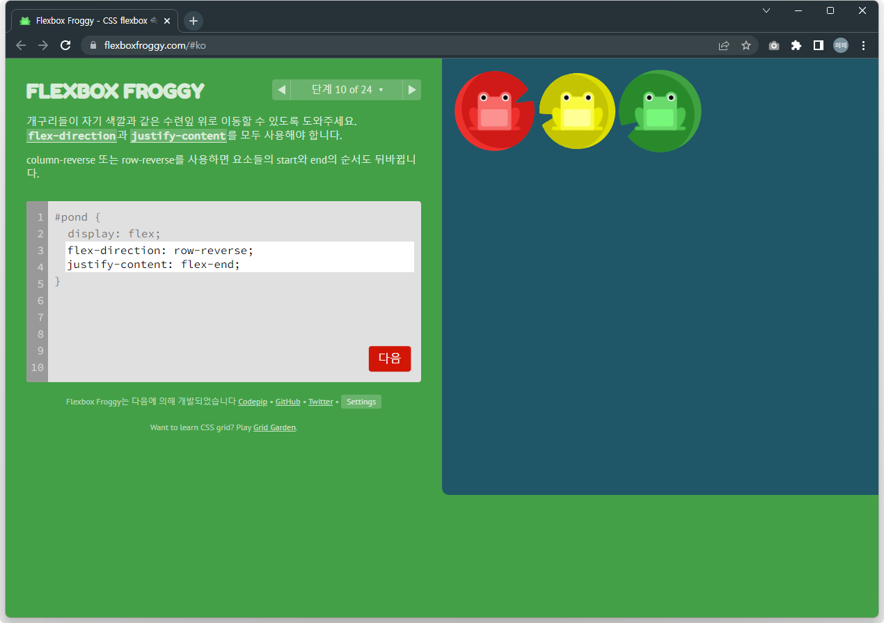 | 재미있게 Flex 공부하기 - Flexbox Froggy 문제풀이 13~24 (0) | 2022.12.02 |