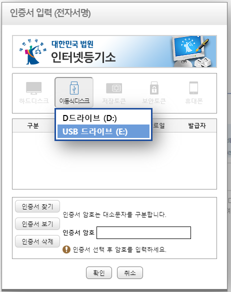 인증서 입력(전자서명) 팝업창이 나타났지만, 인증서가 보이지 않는다면, '이동식디스크' 아이콘을 클릭해줍니다.