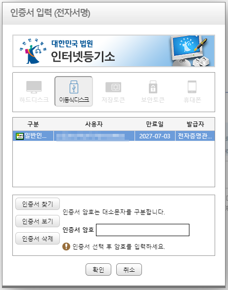 PC의 USB 포트에 발급받은 전자증명서를 꼽은 후 인터넷 등기소 접속.
