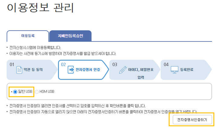 전자신청하기 > 전자증명서 등록 및 관리 > 이용정보 관리 메뉴로 진입합니다.