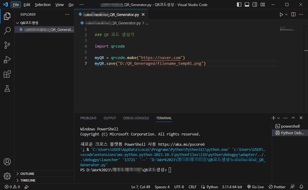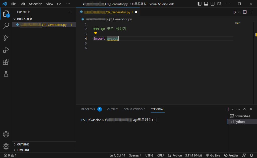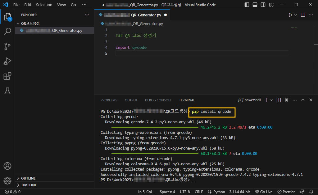 qrcode 모듈이 설치되고 잠시 후, import의 에러표시도 사라졌습니다. 성공!