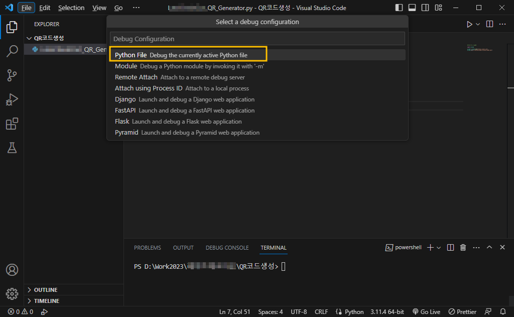 파이썬 코드 실행을 위해서 VSC에서 F5키를 누릅니다.(디버깅)