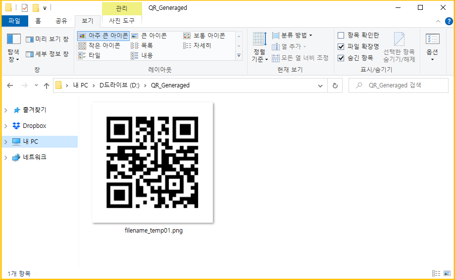 그리고 생성된 myQR 객체의 save() 메서드를 이용해서 D드라이브 경로에 filename_temp01.png 라는 이름으로 저장을 하도록 했습니다.