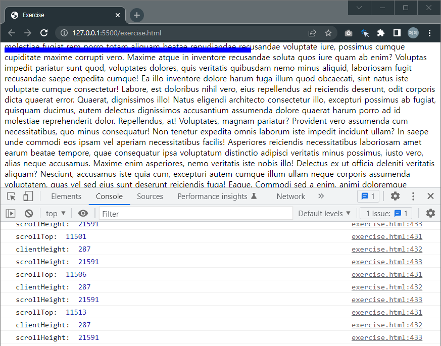 본문 위에서 마우스로 휠버튼을 돌려 스크롤을 해보면, html 태그를 기준으로 scrollTop, clientHeight, scrollHeight가 잘 찍히는 것을 확인할 수 있습니다.