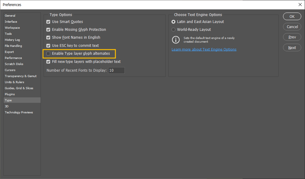 Enable Type layer glyph altermates 체크를 해제해줍니다. 그럼 끝입니다. 참 쉽죠~?