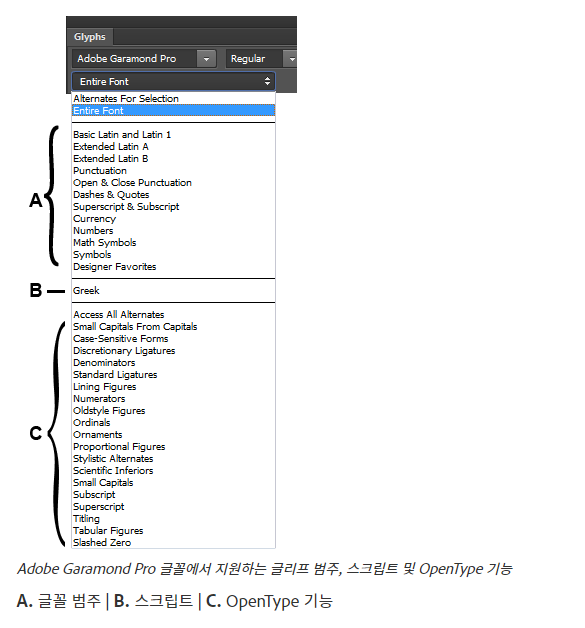 - 또한 글리프는 대체, 장식, 스와시, 분자, 분모, 스타일 세트, 테이블 형식 모양, 서수 등과 같이, 글꼴이 지원하는 OpenType 기능으로도 구성됩니다.
