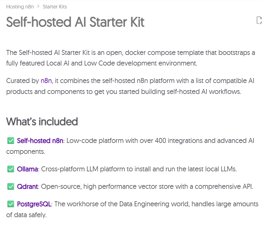 Self-hosted AI Starter Kit에 대한 설명이 보여지면서, 스타터 키트에 무엇이 포함되어 있는지(What's included) 설명을 해주고 있습니다.