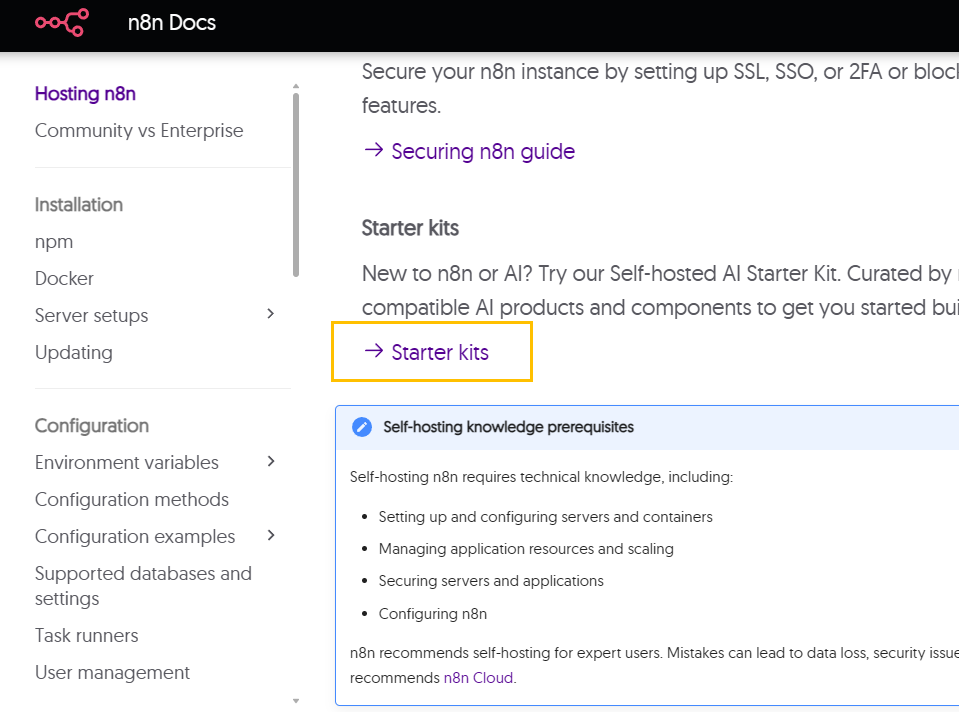 Self-host n8n 페이지의 하단 부분에서 [Starter kits] 버튼을 클릭합니다.