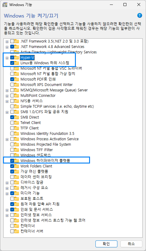 WSL환경을 별도로 구성하지 않은 경우 아래 3가지를 체크해서 켜주도록 합니다.