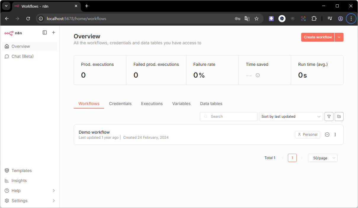 아래와 같이 Overview 화면이 표시됩니다. n8n 설치가 완료되었습니다!! 짜잔~